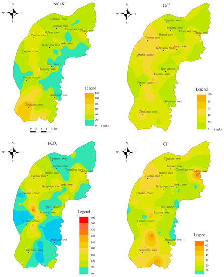 The coefficient of variation shows that there is more pronounced variability in the spatial distribution of ion concentrations. The spatial distribution of main ion concentrations is shown in Figure 3. It can be seen from Figure 3 that the concentration of ions has an apparent zoning phenomenon, which generally presents the distribution characteristics with high concentrations in the central part of the study area and low concentrations in the north and south sides.