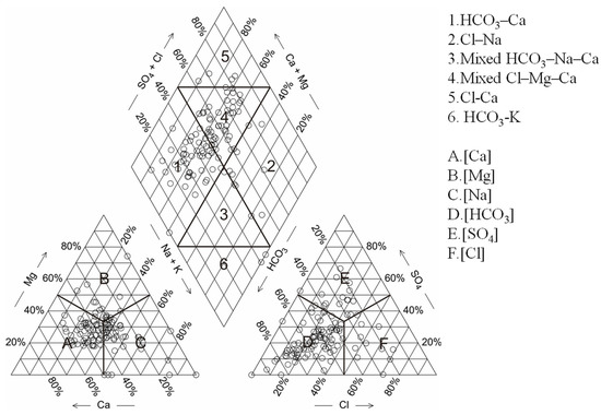 Piper diagrams have been widely used to characterize the composition and evolution of the main ions in groundwater chemistry. The method has an advantage of being independent of human influence [18]. The groundwater samples were put on the Piper diagram, as shown in Figure 4. On the cationic triangle (left-hand triangle), most of groundwater samples were classified as calcium type or mixed type, collectively accounting for 73.34% of water samples. On the anion triangle (right-hand triangle), the bicarbonate and mixed types were predominant, collectively representing 82.71% of all groundwater samples. As seen on the diamond of the Piper plot, the hydrochemical types of groundwater in the study area belong to three categories, including the HCO3-Na·Ca·Mg facies, HCO3·Cl-Na·Ca·Mg facies, and HCO3-Na·Ca facies.