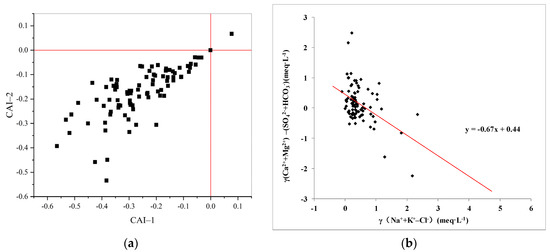 The Chlor Alkaline Indices (CAI) are applied to characterize the intensity of ion exchange during the chemical evolution of groundwater [23]. CAI-I and CAI-II are negative when Na+ or K+ exchange Ca2+ or Mg2+ in the groundwater. However, CAI is positive if reverse ion exchange occurs. As shown in Figure 7, most of the groundwater samples showed negative values for CAI, indicating Ca2+ and Na+ had an ion exchange effect in groundwater. In addition, the ratio of (Na+ + K+ − Cl−)/(Ca2+ +Mg2+ − HCO3− +SO42−) has been widely used to analyze the possible role of ion exchange in groundwater. Moreover, the water samples have a better correlation following the line, indicating that cation exchange has an important influence on groundwater hydrochemistry in the study area.