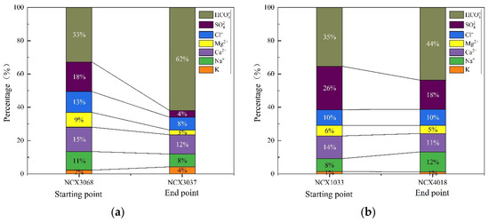 Percentage change of ion concentration along the flow path: (a) path 1; (b) path 2.