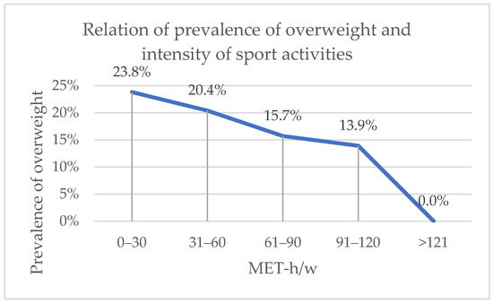 When the relationship between the intensity of sports activities expressed in MET-hours per week (MET-h/w) and body weight status was analyzed, there was a notable trend of decrease in the prevalence with the increase in sports activities intensity. We have found a significant drop in the trendline in subjects with more than 60 MET-h/w (p = 0.032) (Figure 1).