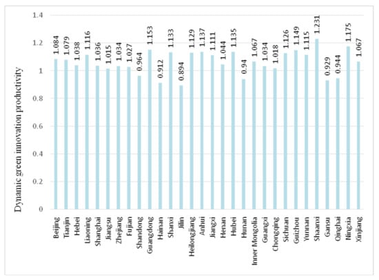 As shown in Table 3, the dynamic green innovation productivity of China’s manufacturing industry from 2009 to 2017 displayed “W-type” fluctuation evolution characteristics. The dynamic green innovation productivity first decreased from 1.583 in 2009–2010 to 0.859 in 2012–2013, then increased to 1.400 in 2014–2015, then decreased to 1.035 in 2015–2016, and finally increased to 1.142 in 2016–2017, it can be calculated that the annual average growth rate is 10%. Concurrently, TECH is always 1, while the average value of TPCH is greater than 1, and TPCH > TECH. The above analysis indicates that from the dynamic productivity perspective, the green innovation performance of China’s manufacturing industry shows a dynamic evolution trend, and green technological progress is the main driving force, while the green technical efficiency does not have an obvious “catch-up effect”. The reasons may be that with the in-depth implementation of the concept of green development, in order not to be eliminated by the market and grasp the development opportunity, manufacturing enterprises are forced to continuously strengthen scientific and technological research and development and tackle key technology problems [,], thereby accelerating the green technology innovation and the dissemination of green technology innovation successes, then promoting the progress of green technological, and finally realizing the dynamic green innovation productivity improvement of China’s manufacturing industry. However, due to the late start of manufacturing industry in China, lack of independent innovation ability, strong technical dependence, and the technical restrictions and technical barriers implemented by the manufacturing power [], which resulted in the improving effect of green technical efficiency is not apparent, and the green technical efficiency has not shown an obvious “catch-up effect”. Hence, in China, green technical efficiency has not become the primary motivator for promoting the dynamic green innovation productivity of manufacturing industry.