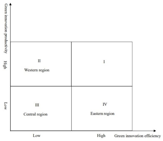 As shown in Figure 4, four combinations of I, II, III, and IV are divided based on the two dimensions of green innovation efficiency and green innovation productivity growth rate in the eastern, central, and western regions. With the combination I being the optimal, different combinations represent different ways to improve the green innovation performance in China’s manufacturing industry. It can be seen as follows: