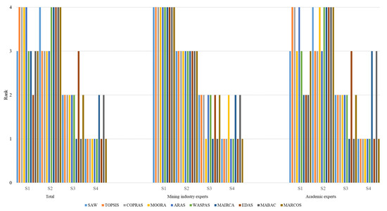 The article [55] presents the results of comparing the efficiency of ten MCDMs (TOPSIS, TODIM, VIKOR, GRA, PROMETHEE, OCRA, ARAS, COPRAS, SAW, CP) for mining method selection.
