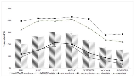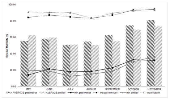 Average, minimum, and maximum temperatures and relative humidity inside and outside the greenhouse are shown per month in Figure 2 and Figure 3, respectively.
