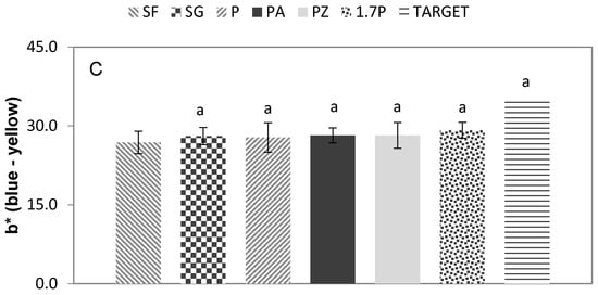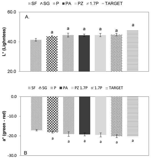 Comparison between the applied treatments (SF—Soil-Field; SG—Soil-Greenhouse; P—Perlite; PA—Perlite-Attapulgite; PZ—Perlite-Zeolite and 1.7P—1.7 times Perlite, in relation to the set Target) showed no significant differences between any of the evaluated color parameters. Average measurements regarding lightness ranged from 43.67 in the Soil-Greenhouse sample, to 44.79 in the 1.7Perlite sample, while the target was set at 47.79. Recorded data comes in agreement with previous studies concerning grape leaf color, mentioning lightness of around 43.9 on the brightest and less mature leaf stage [], and ranging from 40.26 to 44.91 on other Sultana cultivars [].