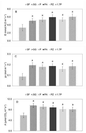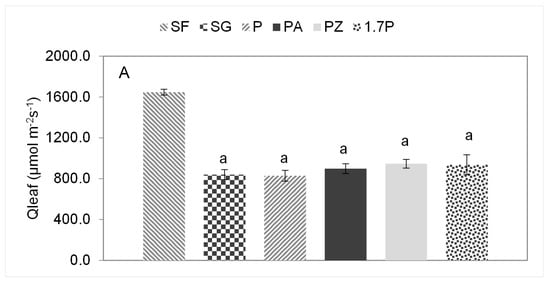 Average of PAR on leaf surface—Qleaf (μmol m−2s−1) (A), transpiration rate—E (mmol H2O m−2s−1) (B), stomatal conductance—gs (mol m−2s−1) (C) and photosynthetic rate—A (μmol CO2 m−2s−1) (D), calculated by nine measurements in the applied treatments through the cultivation period. Bars (±SE) followed by the same letter are not significantly different (p ≤ 0.05). SF was not statistically analyzed.
