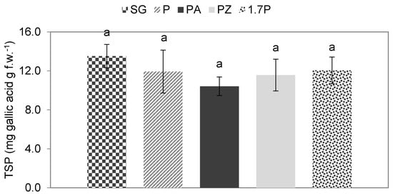 Average of total phenolics in Gallic acid equivalent (mg g−1 f.w.), calculated by four measurements in the applied treatments. Bars (±SE) followed by the same letter are not significantly different (p ≤ 0.05).