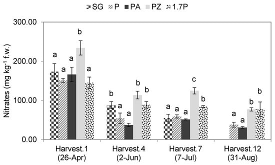 Nitrate results of four random harvests across the cultivation period in the applied treatments. Bars (±STDEV) followed by the same letter are not significantly different (p ≤ 0.05).