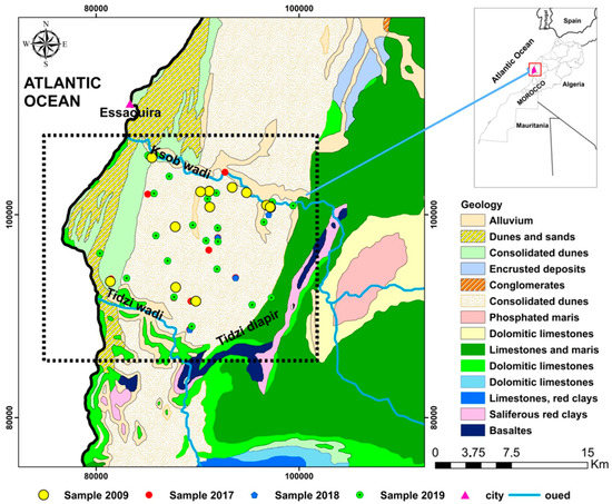 Schematic map of the sampling sites and geology of the synclinal basin of Essaouira.