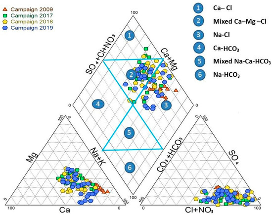 Piper diagram of analyzed samples of four campaign: 2009, 2017, 2018, and 2019.