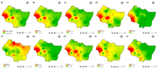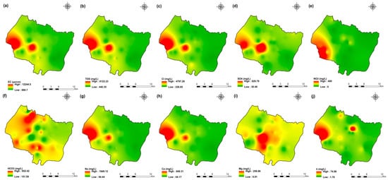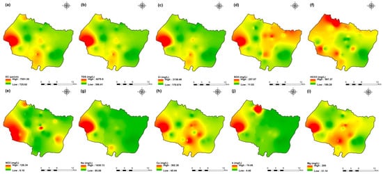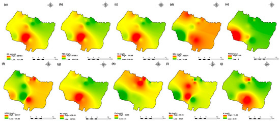 Spatial distribution maps of all physicochemical parameters (a) EC, (b) TDS, (c) Cl, (d) SO4, (e) NO3, (f) HCO3, (g) Na, (h) Ca, (i) Mg, (j) K of 2009 campaign in the KSOB sub-basin.