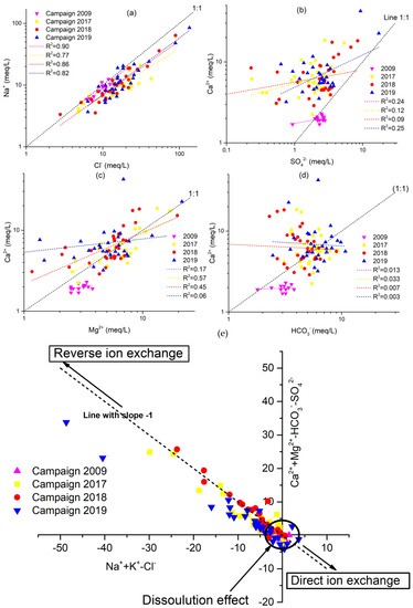 Scatter plots showing the correlation of major cations/anions to discriminate the geochemical processes of 4 campaigns 2009, 2017, 2018 and 2019. (a) Na+ vs. Cl−, (b) Ca2+ vs. SO42−, (c) Ca2+ vs. Mg2+, (d) Ca2+ vs. HCO3−, and (e) [(Ca2++Mg2+) −(SO4−+ HCO3-)] vs. [(Na++k+) − Cl−)].