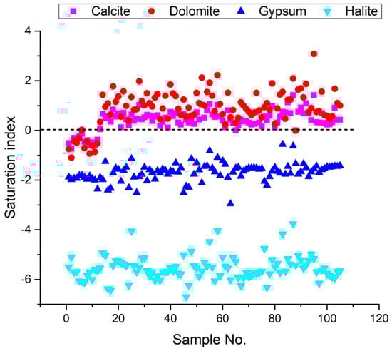 Several processes, such as groundwater flows, recharge and discharge processes, and water-rock reactions, control groundwater’s hydrochemistry [27,30]. The weathering of minerals in the long-term direction of groundwater flow also affects hydrochemistry [75]. The following Equation (8) can be used to calculate the saturation index (SI) of a mineral: