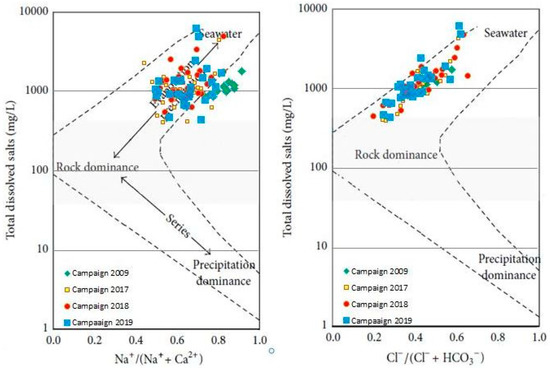 The dominant cation has been present in the 105 groundwater samples for four years. Na+ concentrations ranged from 127.42 to 438.15 mg/L in 2009, 85 to 1430.9 mg/L in 2017, 76.75 to 1464 mg/L in 2018, and 84.28 to 1950 mg/L in 2019, respectively, with a mean of 220.06, 254.28, 278.05 and 346.92 mg/L. The Na+ concentrations are increasing toward the Atlantic Ocean (Figure 4g, Figure 5g, Figure 6g, and Figure 7g). Furthermore, silicate and halite dissolution may increase the concentration of sodium in groundwater [6,23,39,69,70]. In addition, sodium can also come from the exchange of ions [71,72]. The average concentrations of K+ were 7.2, 14.63, 11.20, 12.20 mg/L in 2009, 2017, 2018 and 2019, respectively.