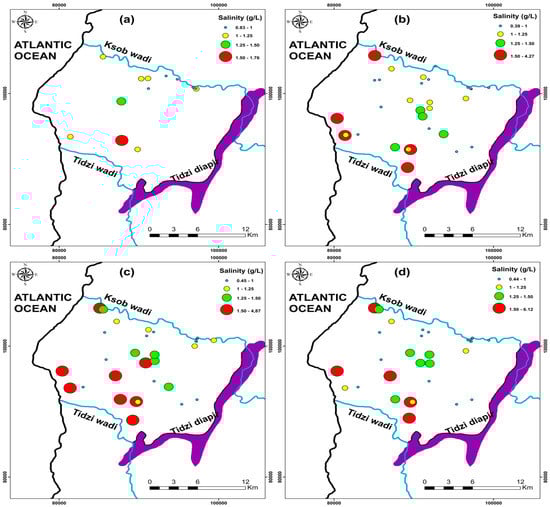 Groundwater is the principal drinking and agricultural water source in water-scarce areas, particularly in dry and semi-arid climates [4,5,8,10,72]. Climate change has recently strained this resource, causing its quality to deteriorate [1,18,78]. The spatiotemporal evolution of groundwater salinity in the KSOB sub-basin has been examined in this regard (Figure 11). The current research salinity values range from 0.83 to 1.76 g/L, with a mean of 1.09 g/L for the 2009 campaign samples (Figure 11a). For the 2017campaign collected points range from 0.39 to 4.27 g/L with a mean of 1.16 g/L (Figure 11b), from 0.45 to 4.87 g/L for the 2018 campaign samples with a mean of 1.39 g/L (Figure 11c), and finally range between 0.44 to 6.12 g/L for the 2019 samples with a mean of 1.38 g/L (Figure 11d). The KSOB sub-basin study area is marked by a lack of industrial activity, a decrease in rainfall, and an increase in temperature, which has resulted in recent drought cycles, lower groundwater levels, and degradation of water quality [12,20,42,69].
