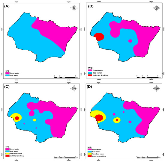Water quality is divided into five categories based on IWQI values: good quality (50 < IWQI < 100), poor quality (100 < IWQI < 200), very poor (200 < IWQI < 300), improper quality (IWQI > 300), and excellent quality (IWQI < 50).