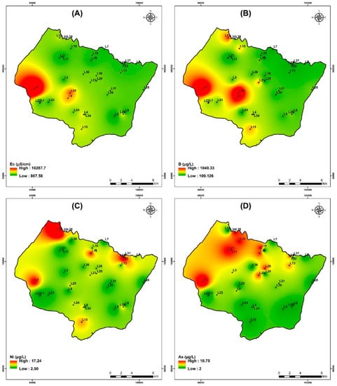 - El Baba, M.; Kayastha, P.; Huysmans, M.; De Smedt, F. Evaluation of the groundwater quality using the water quality index and geostatistical analysis in the Dier al-Balah Governorate, Gaza Strip, Palestine. Water 2020, 12, 262. [Google Scholar] [CrossRef]