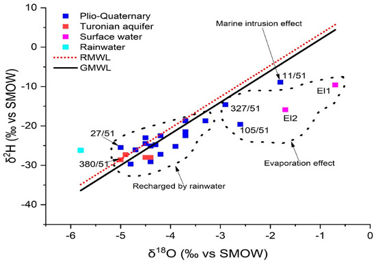 The δ18O–δ2H diagram for the water samples showed that the aquifer recharge is supported by direct infiltration of oceanic precipitation, with negligible evaporation.