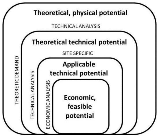 The theoretical potential analyses the occurrence of waste heat in the physical sense as heat with a source above ambient temperature, and it does not consider the possibility of recovering and using this heat. The technical potential, on the other hand, defines the possibility of recovering and using waste heat, and then technological solutions are considered. The technical constraints are, for example: the minimum temperature for a recovery system operation or temperature reduction due to heat transfer. The technical potential for waste heat utilization is determined by boundary conditions and requires the description of technology and determination of the heating or cooling demand. In addition, the technical potential can also be divided into the theoretical technical potential and the applicable technical potential. The first is calculated by means of a theoretical process analysis and the second is calculated on the basis of data, taking into account all the parameters that are specific to the recovery process under analysis. When considering the economic potential, also called feasible potential, financial parameters such as energy prices, interest rates and payback periods are considered [10,11]. Figure 1 shows a graph developed acc. to Ref. [13], which illustrates the methods to estimate waste heat potential.