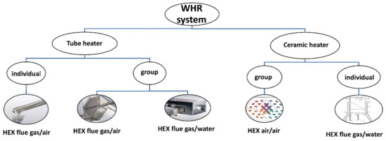 Waste heat recovery systems for gas infrared heaters using flue-gas/water, flue-gas/air and air/air heat exchangers have appeared on the market, providing additional economic benefits. They can be designed for a single unit (individual) or a group (collective) of units [21,27]. Figure 2 shows a new graph presenting the division of heat recovery systems from the flue-gas of gas radiant heaters with exemplary heat exchangers.