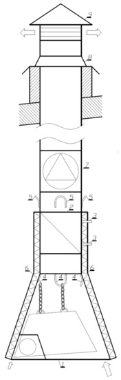 System for heat recovery from ceramic gas heater: 1—hood; 2—heat exchanger; 3—connections for medium; 4—brackets to fix radiators; 5—brackets to fix hood; 6—insulation; 7—fan, 8—roof base, 9—roof ejector [28].