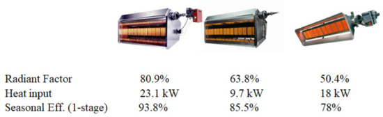 The efficiency of the radiant heater is an important determinant in the selection of a heating system with a heat recovery system because, as mentioned before, the lower the efficiency of the radiator, the greater the recovery potential. Three solutions of the WHR systems with the flue gas/water heat exchanger cooperating with ceramic radiant heaters of varying efficiency with a 1-stage were adopted for analysis. The selected devices are shown in Figure 4 [36].