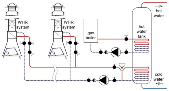 The simplified scheme of a DHW preparation system for production hall workers is shown in Figure 5. The analyzed system consists of infrared heaters to warm the hall, a condensing gas boiler to supply the storage water heater and a WHR system, described above, which supports the production of DHW by means of flue-gas to water heat exchangers supplying the coil of the hot water tank.