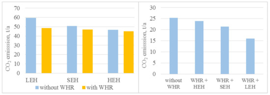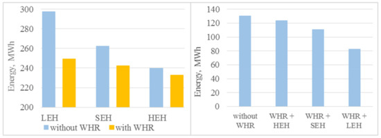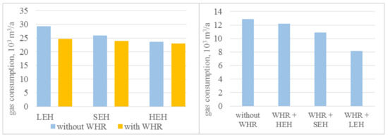 To demonstrate the benefits of WHR, it is necessary to consider the energy demand for both the heating and preparation of DHW. The results of the analysis that included the calculation of the final energy demand of the industrial hall (heating and DHW), without and with WHR, are shown in Figure 6. The waste heat recovery system cooperating with the high-efficiency heater is designated with WHR+HEH, with the standard-efficiency heater—WHR + SHE, and with the low-efficiency heater—WHR + LEH.