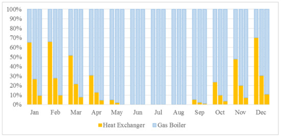 Waste heat utilization is only possible in the heating season during the operation of the radiant gas heaters for heating the hall. The level of heat recovery is not directly dependent on weather conditions, but the operation of radiant heaters depends on the indoor and/or outdoor temperature. In the winter months with the lowest temperatures, the amount of recovered energy is higher than in the warmer months, and in the summer season (June–August) when the heaters are not operating, there is no heat recovery (Figure 7). During the heating season in the coldest months, the LEH+WHR system can cover up to 70% of the energy demand for the preparation of DHW (Figure 7);