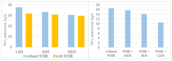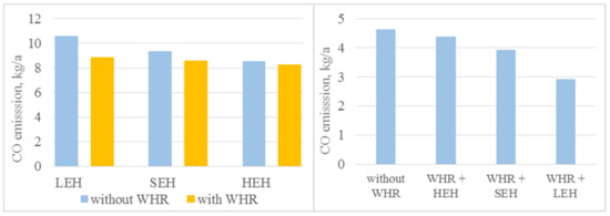 Therefore, the quantity of gas that is burned and the associated emissions of each of the analyzed compounds (CO2, CO and NO2) decreases as the efficiency of the radiant heaters increases. The use of high-efficiency radiators instead of low-efficiency radiators reduces the emissions from the heating system by 19.3%; the use of standard radiators reduces the emissions by 11.8% (Figure 8, Figure 9, Figure 10 and Figure 11). The same trend also occurs when a WHR system is used, but the differences between radiant heaters of different efficiencies are much smaller. The use of high-efficiency devices with a WHR system, instead of low-efficiency devices, also with a WHR system, reduces the total emissions from the heating system and DHW by 6.7%; the use of standard devices reduces the total emissions by 2.9%. The use of a WHR system significantly reduces the emissions of compounds that are associated with gas combustion. For high-efficiency radiant heaters, this reduction is 5.4% in a DHW system and 3.0% when the whole energy demand for a building is considered. For standard radiant heaters, these values are 15.4% and 7.6%, respectively, and for low-efficiency heaters the values are 36.8% and 16.1%.