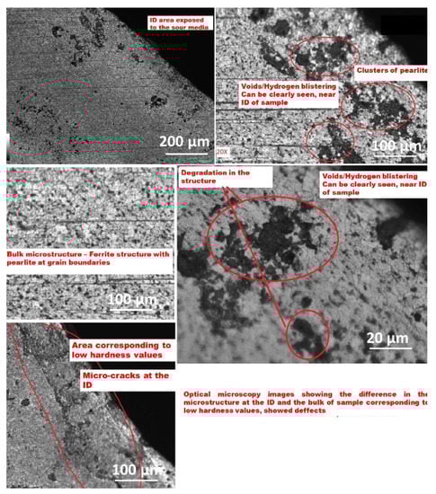 Different points in the defected surfaces were examined by optical microscopy to understand the difference in microstructure at the ID and bulk of the sample. Optical microscopy images, Figure 3, clearly indicate differences in microstructure in the area exposed to service (sample ID) and at the bulk of the samples. The cluster of hydrogen blisters can be seen near the ID of corroded samples. The area near the ID/corroded surface also corresponds to low hardness. The presence of micro-cracks near the ID of the sample is also clearly visible. These findings indicate significant degradation in the material due to long-term exposure to sour service.