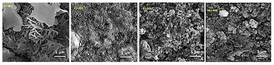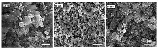 Figure 6 represents the SEM images of the samples with no evident pitting corrosion (A5, A6, B5, B6). It can be noticed that the SEM image of point B5 shows a spherical mineral aggregate. Meanwhile, the caption of the B6 image shows possible sulfur grains.