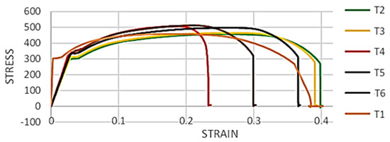 Figure 8 shows the elongated length of all failed samples. It is evident that the elongated length of corroded samples (T4, T5, and T6) is lesser than the elongated length of un-corroded samples (T1, T2, and T3). The difference in the elastic modulus of stress-strain curves is due to the resistance of the sample to elastic deformation; hence, the samples with higher elastic modulus are harder than samples with a lower elongated length. Based on the observed results, the area under the stress strain curve clearly shows a reduction in the toughness of the corroded samples. The loss in yield and tensile strength is evident in all samples (corroded or non-corroded). In wet H2S environments, the H+ ions combine with the electron released by the corrosion of piping, and from atomic hydrogen. More active corrosion yields more atomic hydrogen on the piping surface exposed to the sour service. Atomic hydrogen can recombine to form molecular hydrogen, which is usually harmless for steel. However, this atomic hydrogen recombination reaction rate is significantly reduced due to the presence of H2S. Thus, the accumulated atomic hydrogen on the steel surface can permeate into the steel material and accumulates at available hydrogen traps (inclusions/grain boundaries/laminations/dislocations, etc.). This permeation of atomic hydrogen is directly proportional to the partial pressure of H2S in the service [16,17].