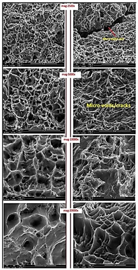 Two fractured surfaces from the tensile test for corroded and non-corroded samples were analyzed with SEM to understand the difference in the failure mode of corroded and non-corroded samples, which are represented by T2 and T4, respectively. Figure 9 shows the SEM images at different magnifications of both samples. Significant differences can be noticed in the failed tips. Micro-voids or cracks can be seen in sample T2. The depth of the cup/cone is significantly more in the T4 sample. Thus, indicating that active corrosion impacts the ductility and microstructure of the piping material. The same was noticed in terms of the elongation% results.