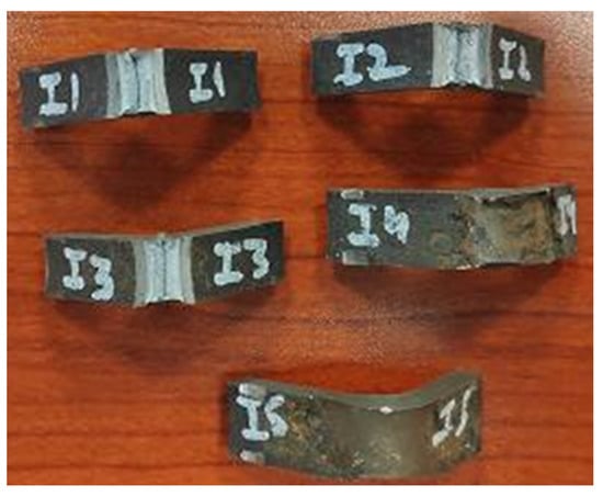 Figure 10 illustrates the broken impact samples. It is evident that the samples without a notch did not break and absorbed more energy. Additionally, the notched samples were not broken into two pieces. However, as per the ASTM standard-E23: If a fractured impact specimen does not separate into two pieces, report it as unbroken. Unbroken specimens with absorbed energies of less than 80% of the machine capacity may be averaged out with the values from broken specimens [14].