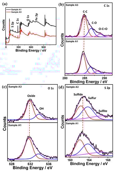 XPS spectrum for samples A1/A3 (a) full survey, (b) carbon, (c) oxygen, and (d) sulfur.