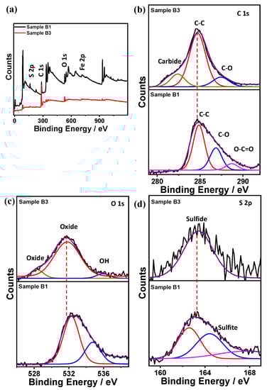 XPS spectrum for samples B1/B3 (a) full survey, (b) carbon, (c) oxygen, and (d) sulfur.