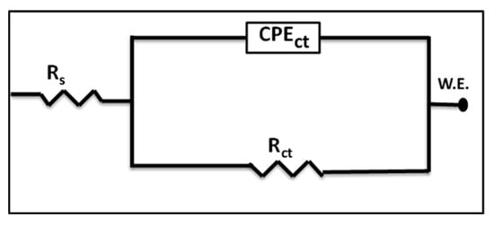 An EIS technique was employed to describe the electrode/electrolyte interfaces quantitatively. It is considered a potent method that can explain the corrosion behavior and calculate their rates [27,28,29,30,31,32]. Figure 13 shows the proposed equivalent circuit (EC) utilized to analyze and fit the collected experimental data. It exhibits the one-time constant equivalent circuit. The parameters of the electrochemical reactions occurring at the metal/solution interface are listed in Table 7, and are measured and calculated from the EIS Nyquist plot, in which the electrolyte resistance (Rs), charge transfer resistance (Rct), constant phase elements for the charge transfer resistance (CPEct), and the deviation parameters (n) from the ideal double-layer capacitance (Cdl) are included.