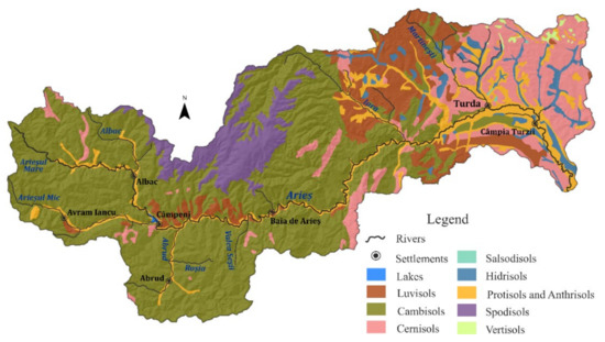 The climate in the region is moderate temperate-continental, with polar and arctic influences in the mountainous area and oceanic influences in the depression area, an annual average precipitation of 810 mm, an annual mean temperature of 8 °C, and a relative humidity of 75–80%. Based on the wide surface of the Arieș basin, it can be stated that the soil classes in the studied area do not present a great variation, the predominant soil class being cambisols, followed by argisols and mollisols (Figure 1).