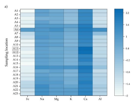 The Shapiro–Wilk test was performed to test the normality of the datasets for all measured elements from the Arieș River basin, and the results are shown in Table 2. In the case of the water samples, most of the elements passed the normality test, as the significance level was below the 0.05 value. However, in the case of the soil samples, the results showed that normality cannot be rejected in the case of Na, K, Cr, Mn, and Al, while in the sediment samples, normality cannot be rejected for Na, K, Cr, Cu, Zn, Mn, and Al, as the p-values were higher than 0.05.