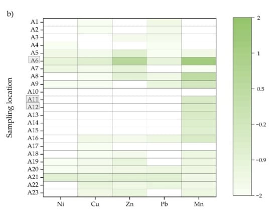 The metal concentrations in water samples are presented in Figure 3 and Table S2. Comparing the metal concentrations among water samples with respect to their highest and lowest concentrations, Cr, Cd, As, and Hg were found in a non-significant or a non-detectable level in the studied surface-water samples (Table 2). Low levels of Fe (≤0.01–0.16 mg/L), Ni (≤0.02–0.14 mg/L), Cu (≤0.02–0.21 mg/L), Zn (≤0.02–0.19 mg/L), and Pb (≤0.01–0.15 mg/L) were detected in the surface-water samples, with non-significant differences between the sampling locations, except the water sampled from A6, where the maximal load of metals was found (8.73 mg/L Fe, 0.15 mg/L Ni, 0.21 mg/L Cu, 4.22 mg/L Zn, and 0.15 mg/L Pb). Oppositely, K, Mg, K, Ca, Mn, and Al concentrations varied considerably across the studied area.