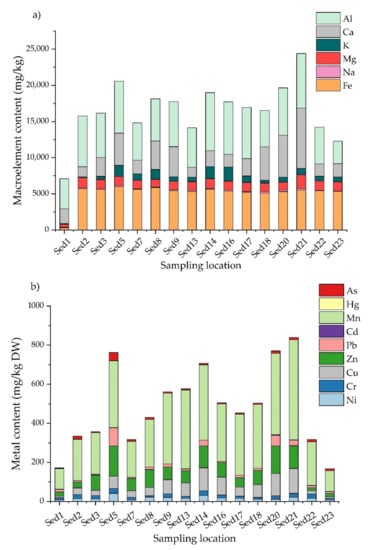 In the case of sediments, Ni, Cr, Cu, Zn, Cd, Pb, and As content exceeded the threshold values for sediments established by the MO no. 161/2006 [35], the highest values being noticed in the case of Sed6 (Table S4). The sediment sampled from Sed6 was characterized by a high content of Na, Pb, and As, while the sediment from sampling station Sed21 recorded the highest values of K, Ca, Mn, and Al content.