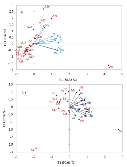 Pb, Ni, and Cu are present due to the mineral deposits in the area and to the untreated acid mine drainage. The findings of Corches [70] showed that acid mine drainage in the Arieș River area is the main source of water pollution with metals. The samples from S2, S3, S7, S9, S13, S16, and S23 are distributed in the upper left quadrant and showed a negative association according to their Mg, Fe, Al, K, Ni, and Mn content, while S17 and S18 are mainly grouped around Ca, Cr, Hg, Pb, As, Zn, Cu, and Na, indicating a negative association as well.