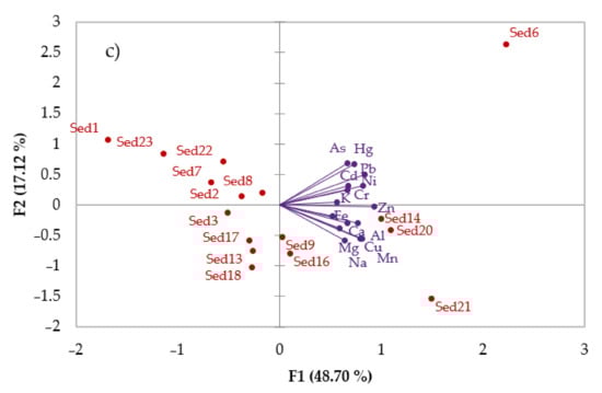 The PCA’s loadings and scores of the PC1 and PC2 are plotted in Figure 5 (water, soil, and sediment samples). The PCA analyses were performed in order to present the relationships among metals and to show the correlation among the variables. The metals grouped together indicate that their contents are intercorrelated.