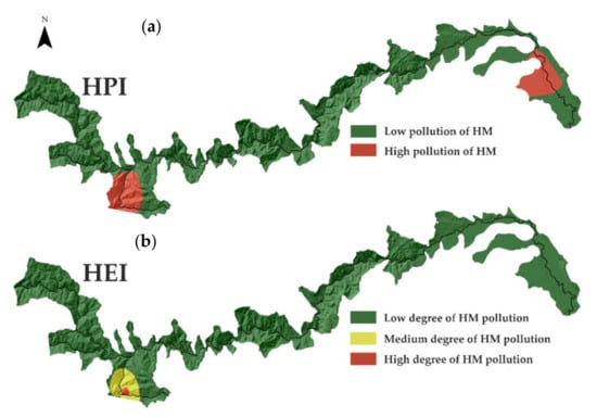 Spatial variation in the heavy-metal pollution index HPI (a) and in the heavy-metal evaluation index HEI (b).