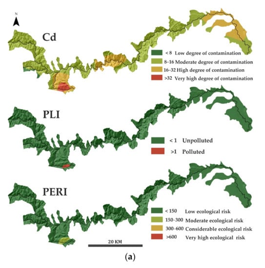 The determination of various pollution indices is one of the most common methods to evaluate the environmental contamination in surface water, soil, and sediments. In this regard, the Heavy-Metal Pollution Index (HPI) is used to evaluate the total effect of different metals on surface-water quality and the Heavy-Metal Evaluation Index (HEI) to show the overall surface-water quality in terms of metals concentration [15,16]. In terms of soil and sediment evaluation, several individual and complex indices are applied to determine the level and type of metal contamination (natural or anthropogenic), such as the Pollution Load Index (PLI), the Contamination factor (Cf), the contamination degree (Cd), the Ecological risks (Er) and the Potential Ecological Risk Index (PERI) [17,18,19].