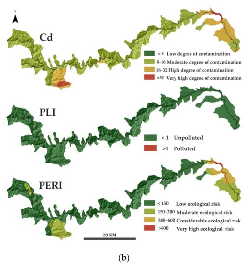 Spatial distribution of the contamination degree (Cd), the pollution load index (PLI), and the potential ecological risk index (PERI): (a) for soil samples; (b) for sediment samples.