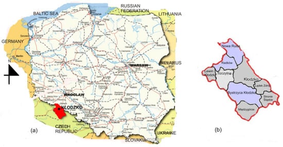 The district of Kłodzko is located in the south-western part of Poland (Figure 1), surrounded by a neighboring country, the Czech Republic, on three sides. It is situated in the southern part of Lower Silesia Province, in the subregion of Wałbrzych and borders the Czech Republic. It has borders with the district of Wałbrzych to the north, the district of Dzierżoniów to the west and the district of Ząbkowice to the north-east. The district of Kłodzko is the largest one in Lower Silesia Province with an area of 1642 km2 [53] and one of the largest in Poland (25th place in terms of area in the country [54]).