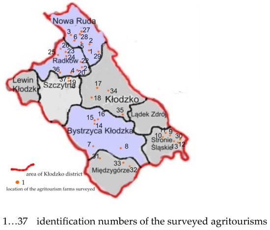 Depending on the adopted source of figures, the number of agritourism farms varies in rural and rural-urban municipalities. To determine the number of farms for the statistical survey, they were randomly selected based on the number in the municipal registers. That is, sixty agritourism farms were chosen at random. The selected farms were visited during fieldwork, five of which proved to be non-active, four were found to be inactive despite being listed in the municipal register. Thirteen farm owners refused to participate in the survey. After a walkover survey, thirty-seven agritourism farms registered in rural and rural-urban municipalities of Kłodzko District (15% of the total number of farms) were selected for further research. The designated agritourism farms are located in seven municipalities of Kłodzko District: Kłodzko, Stronie Śląskie, Radków, Nowa Ruda, Szczytna, Bystrzyca Kłodzka and Międzylesie. Only two agritourism farms are registered in the municipality of Szczytna, so both farms have been surveyed in this case (Figure 2).
